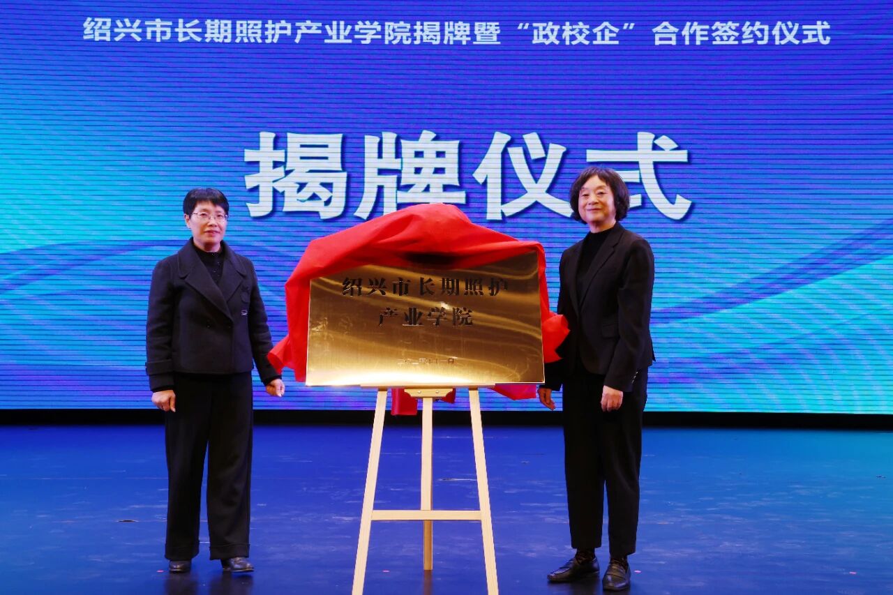 吕智飞、沈丽华为“绍兴市长期照护产业学院”揭牌。