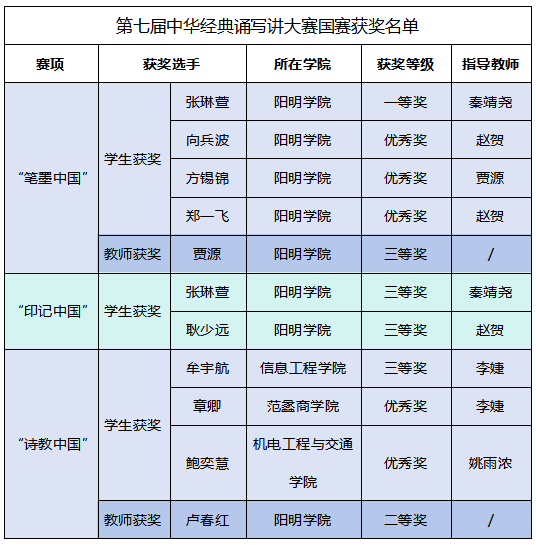 日前,由教育部与国家语言文字工作委员会联合主办的第七届中华经典诵写讲大赛成绩揭晓,我校师生获得一等奖1项、二等奖1项、三等奖4项。其中,阳明学院23书法3班张琳萱同学(指导教师:秦靖尧)荣获“笔墨中国”国赛一等奖,书画艺术(书法)专业专任教师贾源获国赛三等奖。阳明学院通识课程教研室主任卢春红作为浙江省唯一晋级“诗教中国”决赛的教师组选手,获得国赛二等奖。