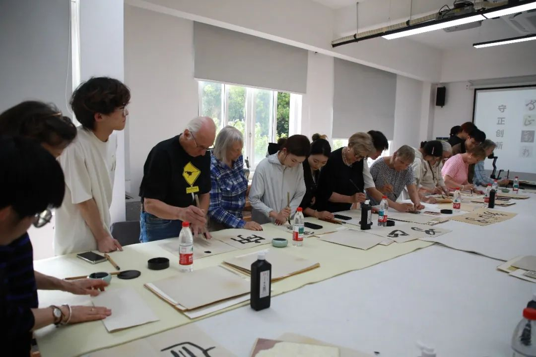 该校阳明学院书法专业教师孙再源为瑞士学员解读了书法艺术语境中“守正创新”的内涵并作现场示范。随后,来自瑞士的学员们纷纷拿起毛笔认真临习。经过两个小时的反复练习,学员们创作出了令自己满意的作品。在花团锦簇的校园内,15位瑞士学员还展示了联合创作的“双腿中间被吸到发软的感觉艺路繁花”十二字作品。